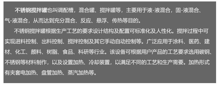 產(chǎn)品概述:不銹鋼攪拌罐也叫調(diào)配槽,混合罐、攪拌罐等,主要用于液-液混合,固-液混合、氣-液混合,從而達(dá)到充分混合、反應(yīng)、懸浮、傳熱等目的。不銹鋼攪拌罐根據(jù)生產(chǎn)工藝的要求設(shè)計(jì)結(jié)構(gòu)及配置可標(biāo)準(zhǔn)化及人性化。攪拌過程中可實(shí)現(xiàn)進(jìn)料控制、出料控制、攪拌控制及其它手動(dòng)自動(dòng)控制等…